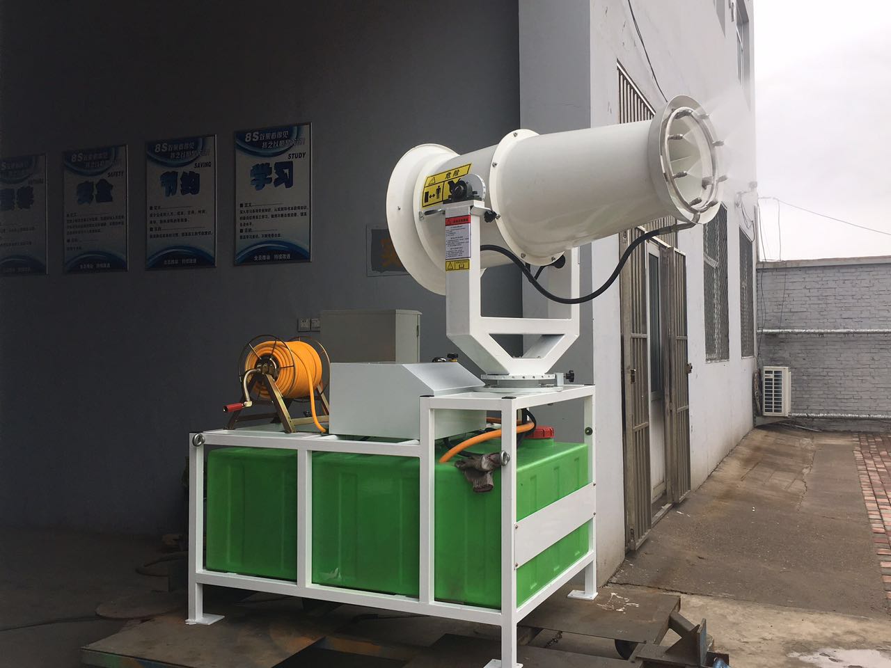 霧炮機(jī)的工作原理:根據(jù)風(fēng)送原理,先使用高壓泵微細(xì)霧化噴嘴將將水化,再利用風(fēng)機(jī)風(fēng)量和風(fēng)壓將霧化后的水霧送到較遠(yuǎn)的距離,使水霧到達(dá)遠(yuǎn)距離同時能夠覆蓋 大面積,水霧與粉塵凝結(jié)后降落,從而達(dá)到降塵的目的。